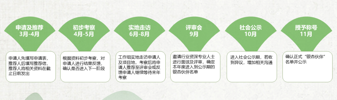 发展阶段。申请人应在其所在的社会创新领域已经有了一定的实践基础。加入银杏伙伴社群,可以起到突破个人成长瓶颈、增强网络领导力、在相应的生态位上扩大影响力,并推动社会问题解决的关键作用。