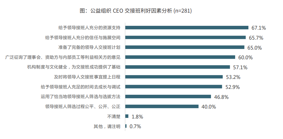 公益机构CEO交接班的利好因素方面,首先是给予接班人充分的资源支持;其次是给予接班人充分信任与施展空间;再次是完备的交接班计划。