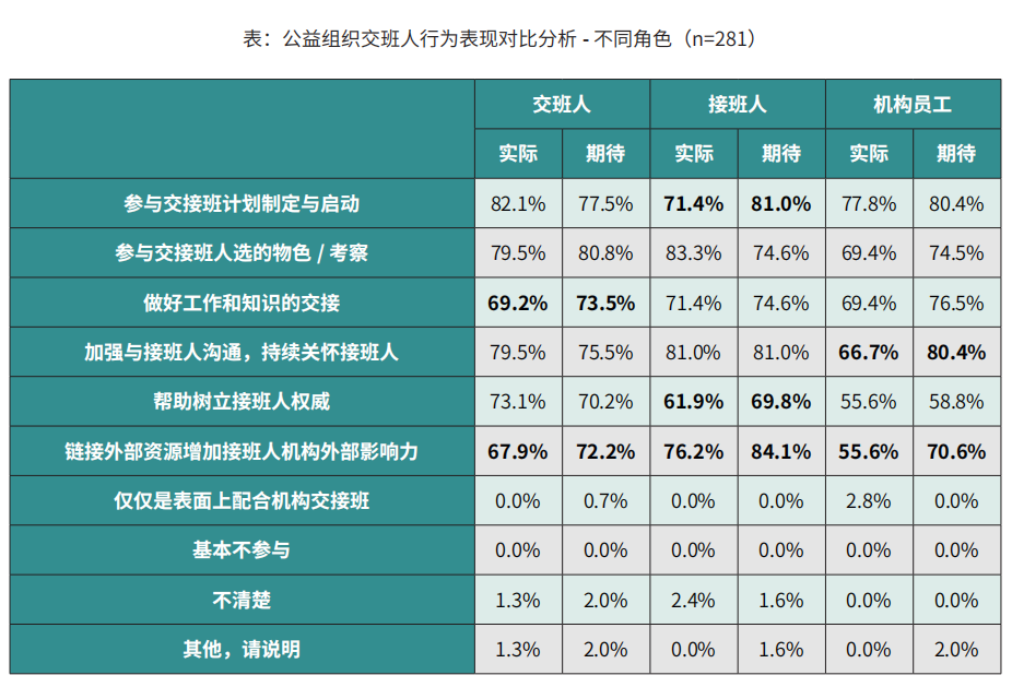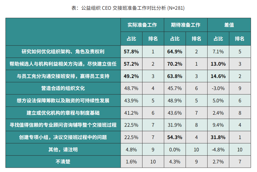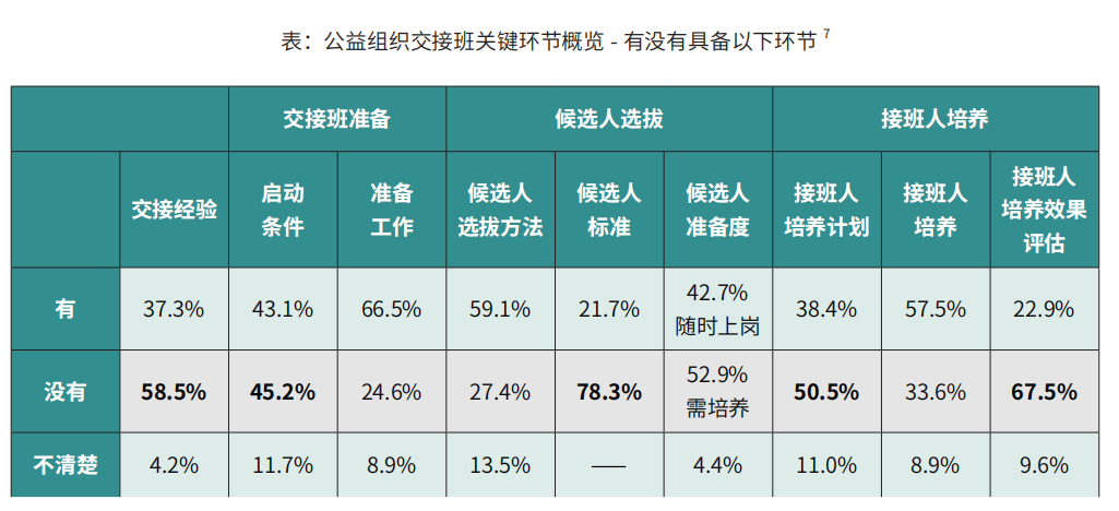 针对做了交接班准备机构而言,明确不同角色的责权利,帮助候选人与机构利益相关方建立信任以及与员工充分沟通交接班安排是公益机构共识性较高的准备工作。