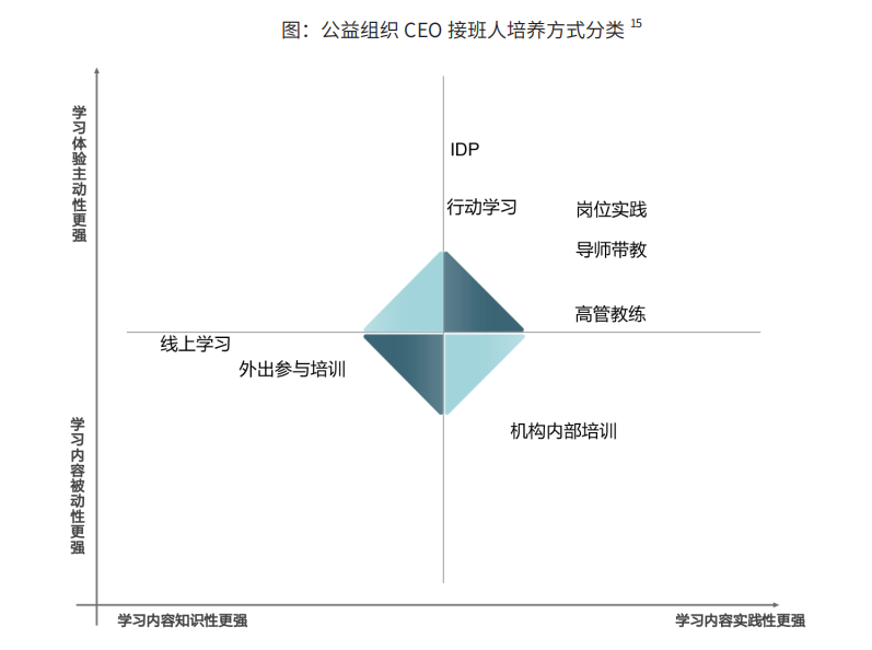 在公益组织交班人认知里应当如何培养候选人,首先想到的是给予各种参与培训的资源与机会,这在帮助候选人打开资源链接范围方面成效显著,也可以提升候选人视野。但这与接班人的视角有一定差异,他们更偏爱学习内容实践性强、学习体验主动性更高的培养方式如个人职业发展计划、行动学习等等。
