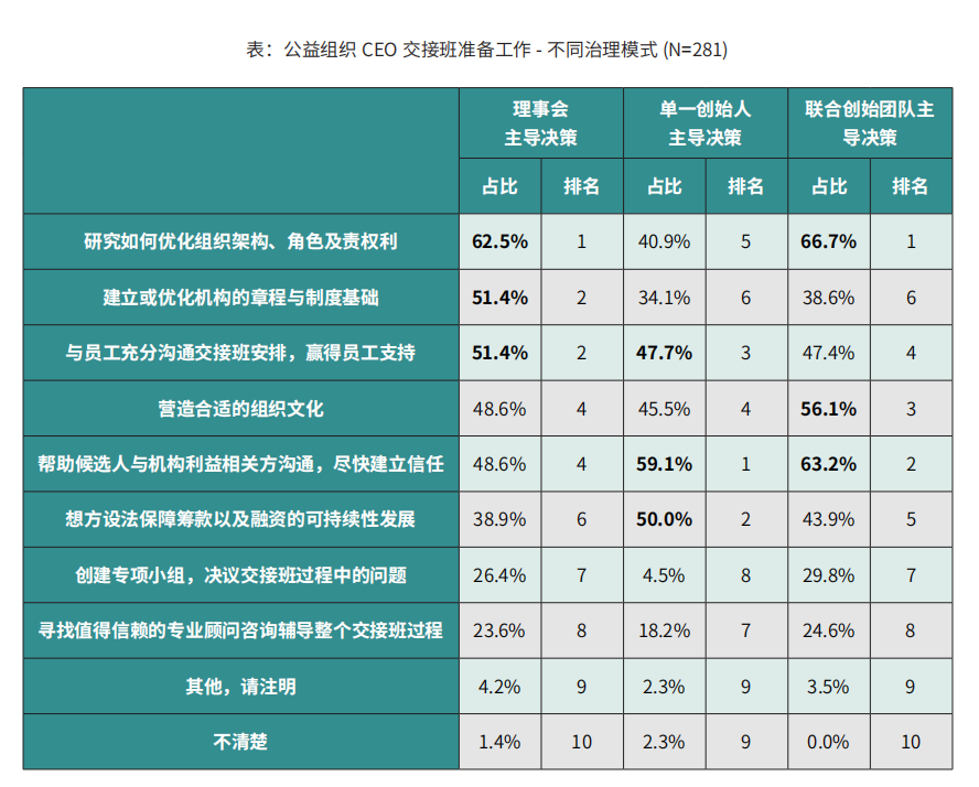 从不同治理模式来看,理事会主导决策和联合创始团队主导决策的机构在交接班准备过程中,非常重视优化组织架构、角色及责权利,占比达到60%以上。此类机构还非常看重优化机构章程与制度。