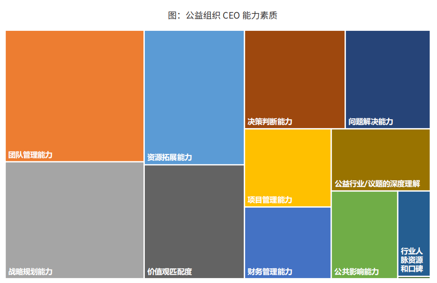 公益组织在对CEO接班人能力素质上的看法上有一定的共同性。排在前五位的能力分别是:团队管理能力、战略规划能力、资源拓展能力、价值观匹配度与决策判断能力。