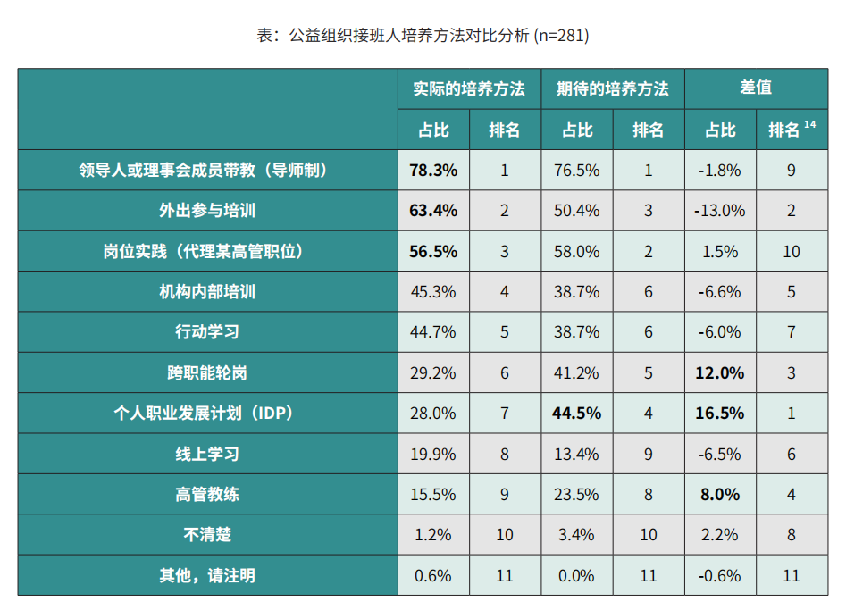 带教、外出培训和岗位实践是当前公益组织CEO接班人培养的常用方式。