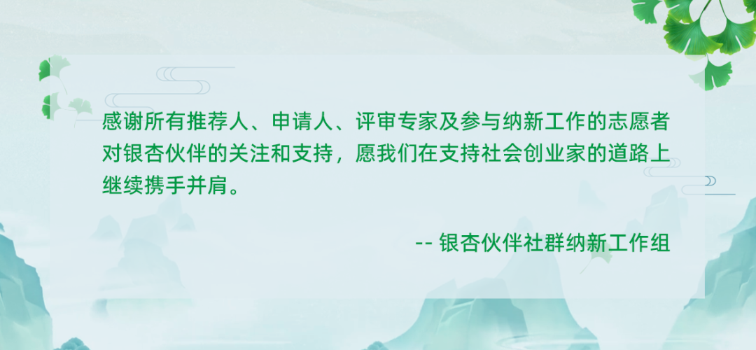 自 11 月 7 日起,10 位社会创业家正式获得 2023 届银杏伙伴称号。欢迎 10 位新伙伴!