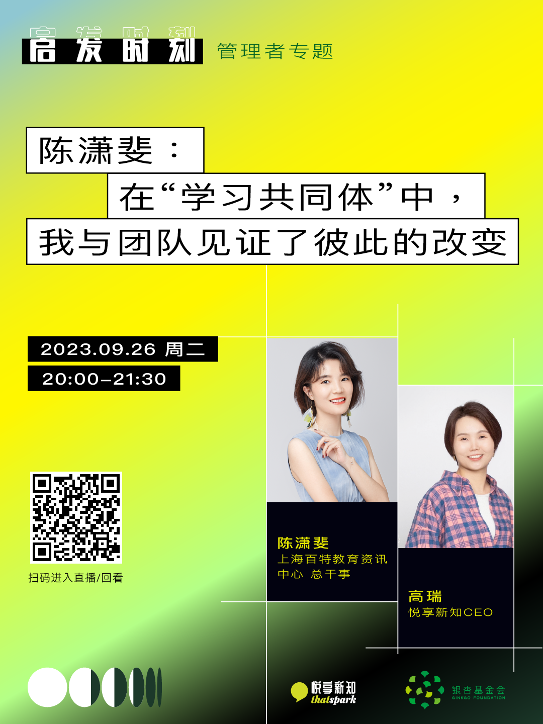 每个人在自己的职业发展道路中完成着一个又一个的突破。而每个突破对于正处于相同场景的伙伴来说,都会是很好的支持资源、引领、慰藉与激发行动。悦享新知与银杏基金会联合推出《启发时刻》系列主题探索,本期管理者专题,陈潇斐分享了她与团队如何一步步共建“学习共同体”,并见证彼此的改变与成长。欢迎扫描文内二维码回看完整版对谈。